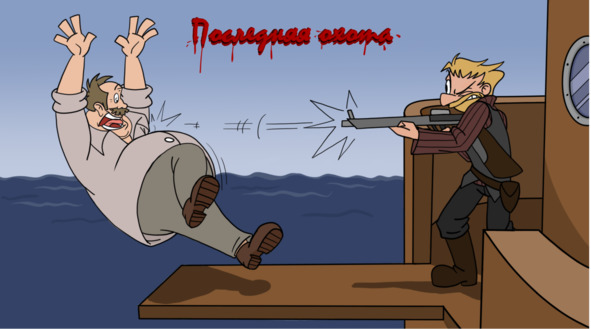 Когда снимали сцены на шхуне, жара стояла неимоверная – сорок градусов в тени, мы в шубах, у всех у нас приклеены бороды, и все эти усы и бороды замазаны стеарином, будто лицо покрыто изморозью. Дубль за дублем, но в какой-то момент пленка заканчивалась. Операторы садились в шлюпку и плыли на берег. Кинопленку хранили на берегу в холодильниках из-за ее особенности быстро сохнуть. И вот пока они гребли на лодках, мы все эти меха снимали с себя и прямо с бортов шхуны прыгали в воду.