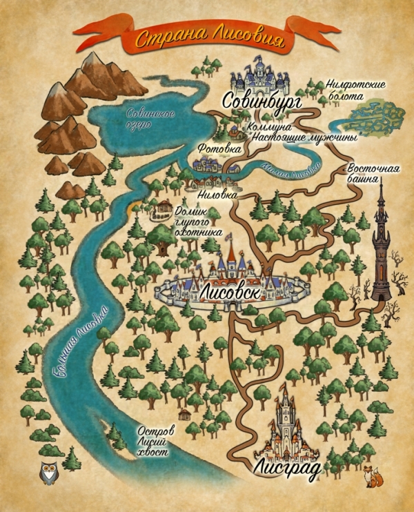И решили братья-сказочники сперва с помощью волшебных чернил обзавестись домашними любимцами. Фот набросал на листе описание ушастой совы, так как очень любил этих мудрых птиц. А Нил подробно описал лисёнка. Так и появились на свет Сова и Лис. Стали зверёк и птица жить в доме вместе с братьями. Глуповатый лисёнок постоянно в разные неприятности попадал, а ушастая сова его всё время спасала и поучала. А Фот и Нил наблюдали за проделками своих любимцев и истории про них писали. Не волшебными чернилами, а самыми обычными. Накопилось у братьев историй на целый том. И разослали они свои творения по издательствам. Вышел в свет большой сборник рассказов братьев Лисовских. Прислали им авторские экземпляры, да гонорар отправили переводом. Обрадовались авторы такому успеху и решили создать целый сказочный мир. Порешили, что будут они жить в этом созданном мирке да писать книги про его обитателей. Долго думали, как сделать вход в свою сказочную страну. И решили использовать свои любимые портфели, которые у них ещё со времён учёбы остались. У Фота был с изображением совы, а у Нила с лисом. Оставили они портфель Нила на чердаке дома, а сумку Фота в выдуманную страну перенесли. И можно стало теперь легко перемещаться из настоящего мира в сказочный. Прыгаешь двумя ногами в открытый портфель Нила, а вылезаешь уже в сказочной стране из портфеля Фота. А страну свою братья Лисовией назвали. Описали они в ней природу живую и неживую: реки, озера, горы, леса, зверей, птиц и насекомых. А затем стали населять Лисовию жителями. Причём Фот описывал своих героев только с положительными качествами, делал их честными, благородными, смелыми, умными, трудолюбивыми. А Нил, напротив, одарял своих трусостью, жадностью, ленью, недалёким умом. Ведь не могут же в стране проживать только положительные герои. Разве интересные тогда рассказы будут. В центре страны, там, где находился портфель Фота, появилась столица с названием Лисовск. На севере Фот создал себе город Совинбург, а Нил себе на юге город Лисград. Жили они и творили в своих городах, время от времени наведываясь в Лисовск для совместного написания очередной книги. Затем одни из них отправлялся в реальный мир и пересылал рукопись в книжное издательство.