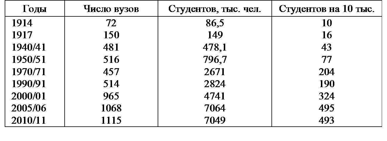 При этом в первую очередь следует обратить внимание на рост числа высших учебных заведений, поскольку именно специалисты высшей профессиональной компетенции являются детерминантой общекультурного состояния страны, именно они занимают ключевые позиции в промышленности, сельском хозяйстве, финансовой сфере, а также в системе государственного, регионального и муниципального управления. Именно специалисты высшего уровня определяют состояние здравоохранения и составляют ядро интеллектуального потенциала. С учетом сказанного крайне интересна динамика трех важнейших показателей, характеризующих состояние высшего образования: количество вузов, количество студентов и число студентов на 10 тыс. жителей. Вот как выглядит эта динамика с 1914 по 2011 г. (табл. 6).