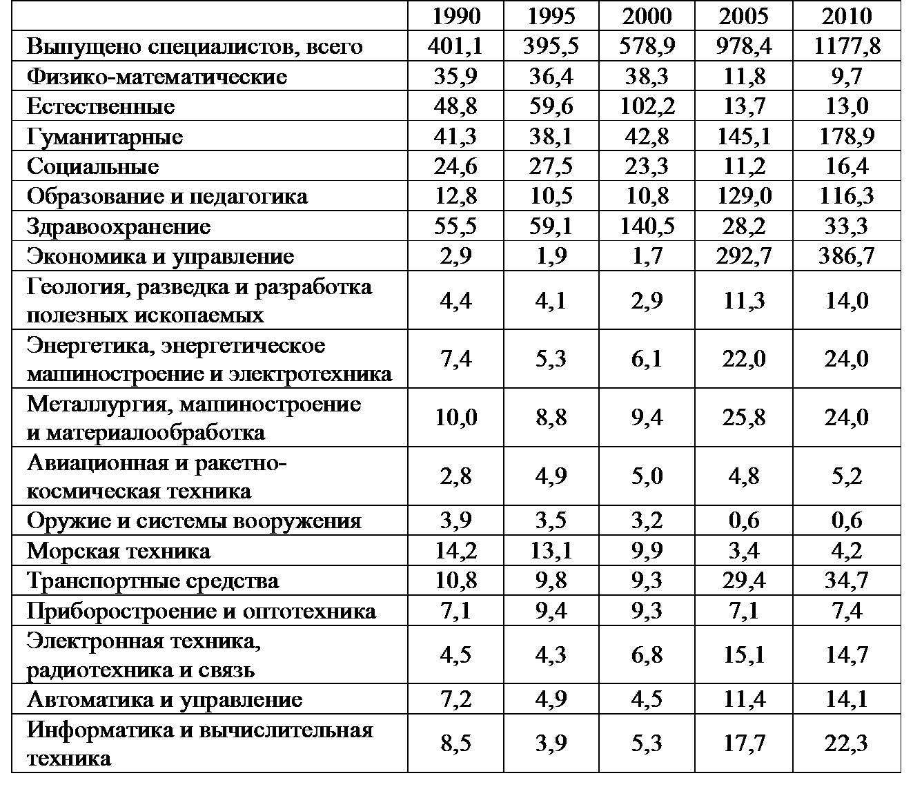 Хорошо известно, что переходные эпохи характеризуются различными так называемыми «перекосами», резкими изменениями, всплесками и падениями, протеканием многих социально значимых процессов. Это в полной мере относится и к проблемам высшего, среднего и начального технического образования, а также общего основного. В постсоветской России начал быстро развиваться так называемый «дикий капитализм». Одновременно происходили процессы деградации промышленных предприятий, особенно в обрабатывающих отраслях, и бурный рост всевозможных финансовых, торговых и сервисных организаций, учреждений и предприятий. Быстро рос спрос на специалистов в области финансов, торговли, туризма, культуры и т.д. Вместе с тем тысячами закрывались промышленные предприятия. Профессии инженеров различных специализаций, за исключением, может быть, специалистов в области информатики и информационных технологий, становились все менее престижными. Помимо уже существовавших государственных и муниципальных высших учебных заведений начали десятками, а то и сотнями возникать частные коммерческие учебные заведения, в том числе и высшие. Качество преподавания в них было весьма невысоким. Состав ППС пополнялся людьми, зачастую не имевшими ученых степеней и званий, а также опыта научно-исследовательской и преподавательской работы в вузах. Коммерческие учебные заведения готовили специалистов гуманитарно-социальных специальностей, преимущественно экономистов, финансистов, юристов. Количество выпускников инженерных профессий в первом десятилетии XXI в. составляло не более 30 % от общего числа выпускников вузов. Представление о том, как менялась структура высшего образования, можно составить исходя из табл. 7.