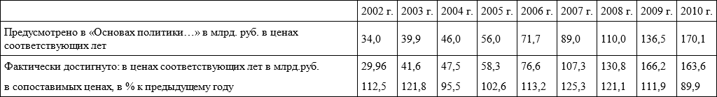 Финансовое обеспечение научно-технической деятельности основывается на его целевой ориентации и множественности источников финансирования. Финансирование осуществляется за счет средств федерального бюджета, внебюджетных источников (собственных или привлеченных средств хозяйствующих субъектов и их объединений, а также средств заказчиков работ), иных источников в соответствии с законодательством Российской Федерации. Минимальные объемы бюджетного финансирования научных исследований и экспериментальных разработок гражданского назначения в Российской Федерации на 2002–2010 гг. определены в «Основах политики Российской Федерации в области развития науки и технологий до 2010 года и на дальнейшую перспективу» (утверждены Президентом Российской Федерации 30 марта 2002 года № Пр-575) [3] (далее – «Основы политики…»). В табл. 2 приведены данные о расходах на гражданскую науку из федерального бюджета в сопоставимых ценах.