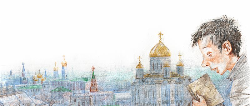 С книгой в руке Миша влез на подоконник и открыл окно. Шум и грохот улицы ворвались в комнату. Во все стороны расползалась громада разноэтажных зданий. Решетчатые железные балконы казались прилепленными к ним, как и тонкие пожарные лестницы. Москва-река вилась извилистой голубой лентой, перехваченной черными кольцами мостов. Золотой купол храма Спасителя сиял тысячью солнц, и за ним Кремль устремлял к небу верхушки своих башен.