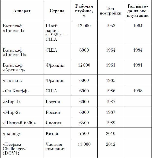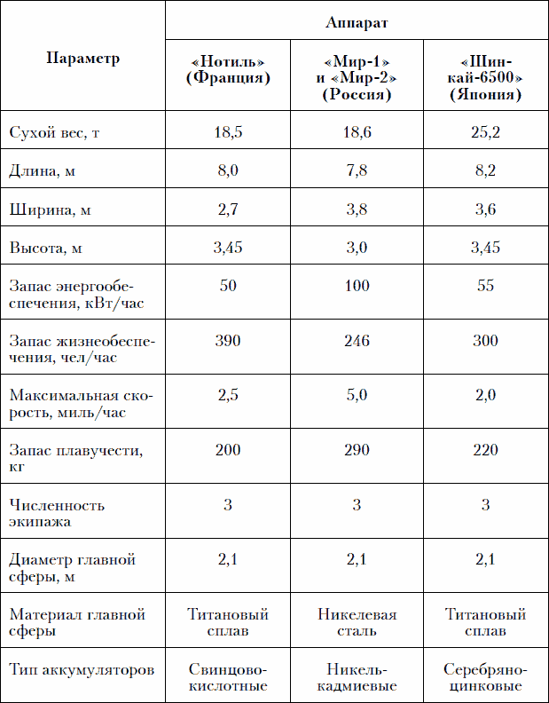 В настоящее время эксплуатируются лишь пять таких аппаратов: французский «Нотиль», японский «Шинкай-6500» китайский «Яолонг» и наши отечественные «Миры». Сравнение их технических данных показывает несомненное преимущество ГОА «Мир», обладающих наибольшей энергоемкостью и высокой скоростью передвижения под водой, что очень важно с точки зрения эффективности использования глубоководных обитаемых аппаратов.
