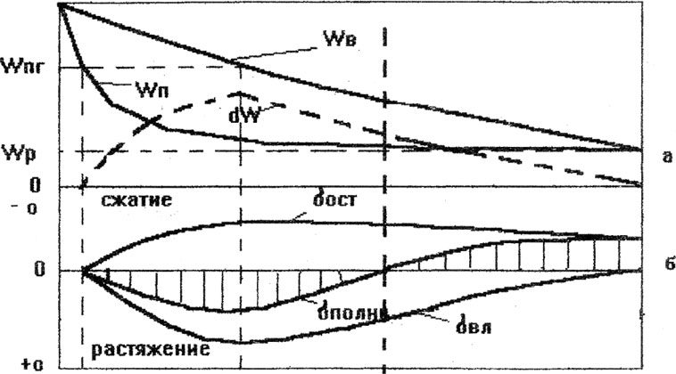 Рис. 6.1. Диаграмма изменения влажности и напряжений в процессе сушки пиломатериалов.