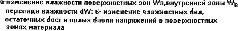 На рис. 6.1.показана диаграмма изменения влажности и напряжений в процессе сушки древесины. Мы видим, что влажностные напряжения в процессе выхода влаги из древесины сводятся к нулю, а в то же время остаточные напряжения остаются и уменьшаются до конечной величины.