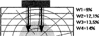 Мы видим, что при глубине проникновения на двух уровнях средняя влажность равна примерно Wср1=(9+12,1)/2=10,5 %. В тоже время на глубине она равна примерно Wср2=(13,5+14)/2= 13,7 %. Общее же значение будет равно примерно Wср3=(9+12,1+13,5+14)/4= 12,1 %.