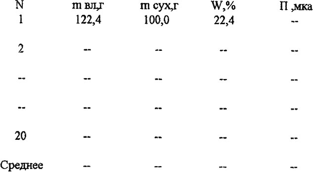 где: N – номер образца m вл. – масса образца до сушки, г m сух – масса образца после сушки, г W – влажность образца,% П – показания прибора, мка