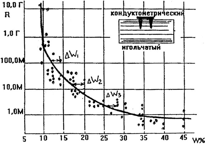 Рис. 11.1. Зависимость электрического сопротивления от влажности при втыкании игл вдоль волокон.