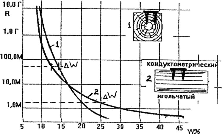 Рис. 11.3 Сравнительные зависимости электрических сопротивлений от влажности при втыкании игл вдоль (2) и поперек (1) волокон.