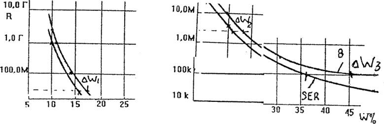 Мы видим, что хар-ки отличаются друг от друга. Так, например, если ИВлаг 1 дает показания при сопротивлении 100 ком равным 35, 2 % W, то для ИВлаг 2 при том же сопротивлении значение влажности будет соответствовать 50 %. Таким образом разность показаний между двумя ИВлаг dW = 14,8 %. Естественно при уменьшении влажности эти расхождения будут уменьшаться.