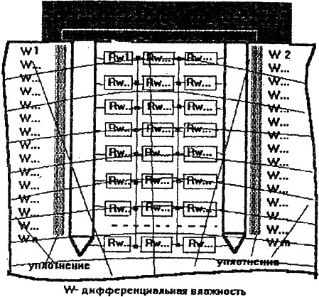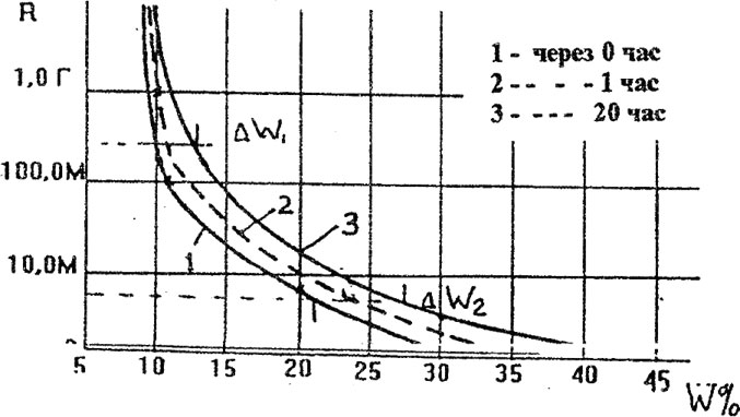 Рис. 13. Семейство зависимостей R=f(W%), построенных при временном дрейфе влаги в процессе контроля.