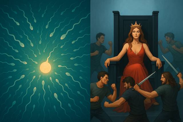 Её оболочка выделяет химические сигналы – своего рода “запах” или “ключи”, которые привлекают определённых сперматозоидов. У каждого сперматозоида – свой “запаховой рецептор”, так что притяжение может быть очень избирательным. Сильный – не всегда победитель. Первый, кто добрался, не обязательно оплодотворит яйцеклетку. Всё зависит от того, сработает ли биохимическая совместимость. Яйцеклетка может “отвергнуть” сперматозоид, даже если он первым прорвётся к ней. Оплодотворение – это кооперация, а не насилие. Успешный сперматозоид не «ломает» яйцеклетку, а проходит через определённый молекулярный процесс слияния. Только когда оба “согласны”, происходит оплодотворение. Это как рукопожатие: если одна сторона не готова, контакт не случится.