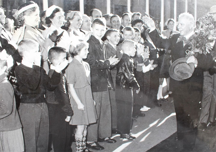 На этой фотографии запечатлена встреча правительственной делегации с работниками советского посольства. Хорошо одетые дети располагались у края линии вдоль красной ковровой дорожки. На второй линии стояли сотрудники советского посольства. Партийные лидеры и члены правительства шли по красному коврику. Когда они подходили к этой советской группе, то все начинали восторженно махать цветами и радостно хлопать в ладоши.