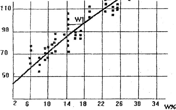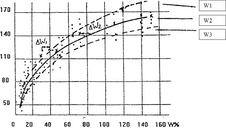 На рис. 15.1.,15.2. Пунктиром выделены области, в пределах, которых может находиться множество экспериментальных точек. По мере приближения к номинальной хар-ке они будут плотнее располагаться друг к другу. Эти хар-ки имеют форму рога, который сужается к малым значениям влажности.