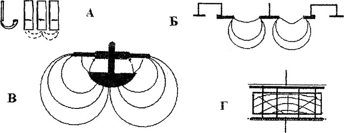 Рис. 15.3. Возможные варианты конструкций безигольчатых датчиков влажности. Односторонние: А) 3 скобы. Б) Концентрические кольца, В) Сплошной круг, Г) Двусторонний