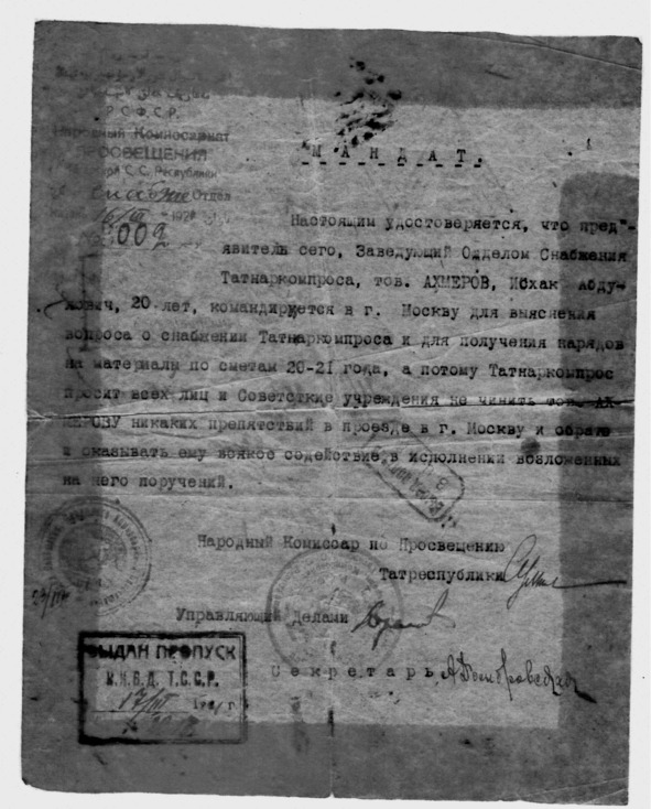 Мандат завотделом снабжения Наркомпроса ТССР И. А. Ахмерова, 1921 г.