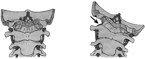 Рис. 1. Сужение или полное сдавление одной из позвоночных артерий в месте сгибания сосудисто-нервного пучка позвоночной артерии задней поверхности тела первого шейного позвонка при повороте головы в противоположную сторону