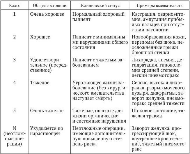 Мнения большинства авторов относительно классификации степеней риска совпадают. Основными критериями оценки являются соматическое состояние животного и тяжесть оперативного вмешательства.