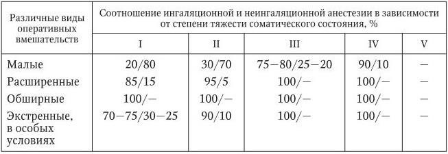 При отсутствии выраженных нарушений соматического состояния пациента проведение незначительных по объему операций выполняется, как правило, под неингаляционной анестезией. С возрастанием степени операционного риска при выборе вида общей анестезии предпочтение отдается ингаляционному наркозу как наиболее безопасному и управляемому. Существует обоснованное мнение, что последний позволяет постоянно контролировать уровень анестетика в организме, обеспечивает быстрый и относительно легкий период пробуждения даже после нескольких часов анестезии (табл. 2).