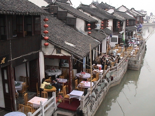 Вдоль извилистой специально приготовленной речки с обеих сторон были построены дома в традиционном китайском стиле города Сучжоу, где размещались в основном сувенирные и художественные лавки и чайные, весь обслуживающий персонал которых также был одет в китайские национальные одежды. По импровизированному каналу плавали такие же лодки в китайском стиле, управляемые лодочниками в черных китайских халатах. И хотя была понятна вся лубочность этих действий, выглядело это очень красиво.