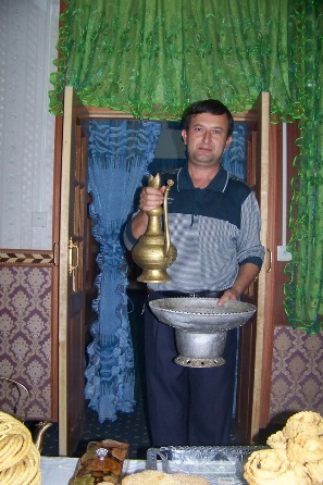 Перед обедом хозяин принес медный таз и старинный, высокий бронзовый кувшин с изогнутым носиком, полный воды, и сам полил на руки каждому гостю. Это тоже входит в ритуал приема гостей. Затем на двух больших блюдах подали плов. Настоящий среднеазиатский жирный плов с кусками баранины, изюмом и курагой. Но… без ложек. Уйгуры деловито стали руками сминать маленькие комочки плова и отправлять в рот, показывая мне, чтобы я поступал так же. Я честно попытался проделать то же самое, но руки тут же стали жирными, что было не очень приятно. Заметив мое напряжение, Абдукерим попросил хозяина принести этому кафиру (неверному) ложку. Дело пошло значительно быстрее.