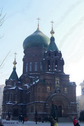 На обратном пути побывали в русской православной церкви. К сожалению, русским этот храм святой Софии был только снаружи. Внутри церковь превращена в этнографический музей города Харбина. Все стены, на которых еще кое-где сохранились следы от фресок, увешаны стендами с фотографиями старого Харбина. Есть макет старого города и макеты других русских церквей, не доживших до настоящего времени.