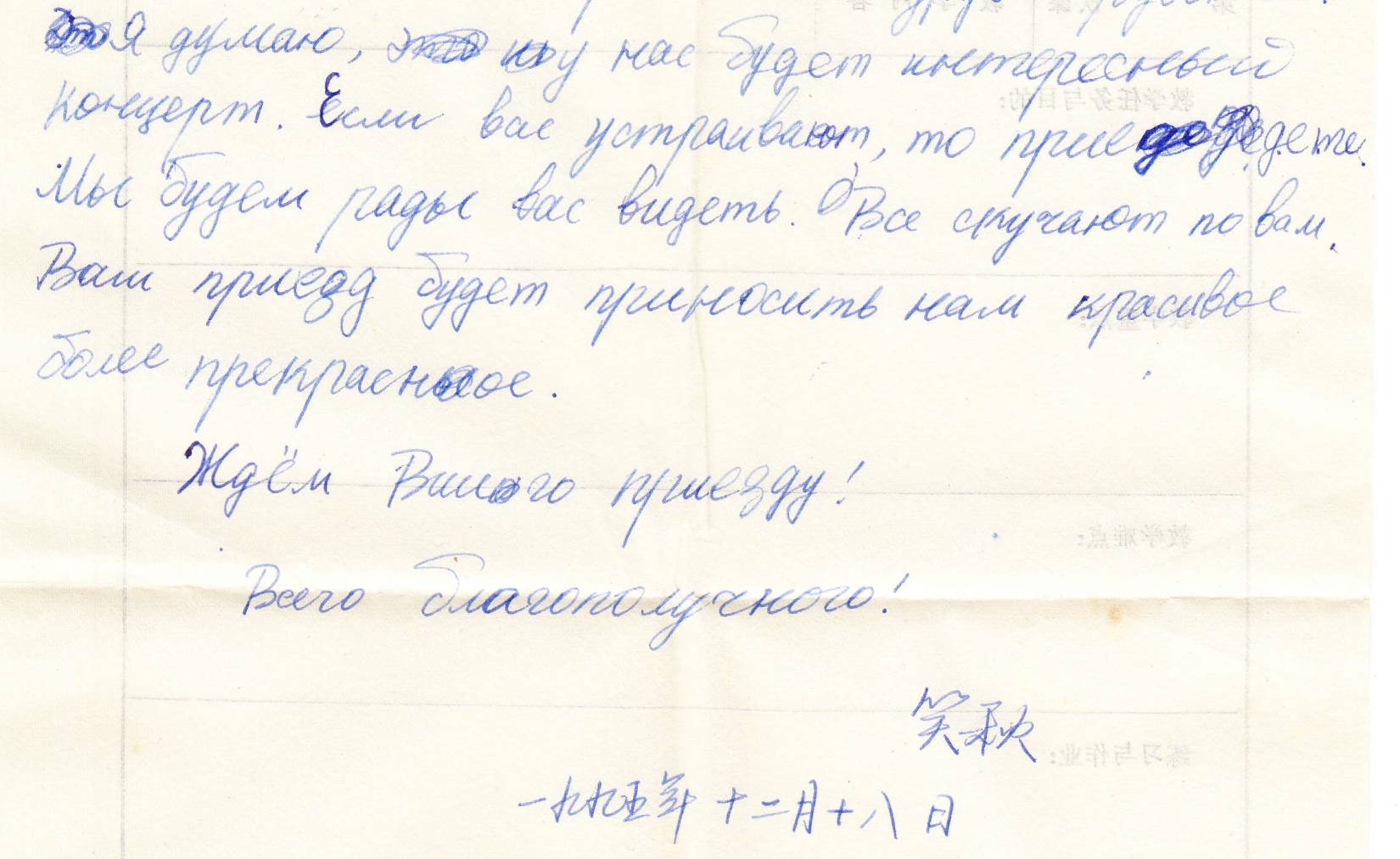 «Несколько слов помимо работы. Уважаемый Анатолий Степанович вы учили нас устной речи. А теперь вы скорое поедете домой. Я рада, что вы встретитесь со своими родными, но мне очень тяжело. В Китае есть пословица: «Кто один день был учителем, тот на всю жизнь остается отцом…» Это так. Я навсегда сохраню в памяти нашу дружбу. Вы не только учили нас, но и в жизни заботились о нас. По-моему, вы самый хороший преподаватель в мире. У меня много слов, которые я хотела бы сказать, но я не смогу написать их по-русски. Я никогда не забуду вас. Вы не только мой хороший преподаватель, но и мой ближайший друг. Я буду стараться овладеть русским языком в совершенстве, чтобы вновь увидеть вас в России». Юля Сюй Дунминь.