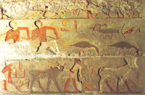 На стенах погребальной камеры роспись с животными и охотящимися на них людьми (рис. 58). Картины выполнены с использованием инкрустаций из стекловидной эмали. Эти шедевры изобразительного искусства выставлены в Каирском музее.