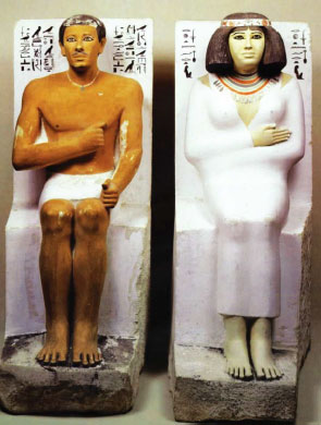 Как видим, уже в это время египтяне достигли прогресса в скульптурном ваянии и живописи. Краски изготавливали из минералов и растительных веществ. Чёрную из угля, красную из охры, белую из толченого известняка, синюю из меди и кобальта, зеленую из малахита, желтую из окиси железа. Растертые в порошок минералы разводили не в масле, а в воде, добавляя яичный белок, клей, камедь.