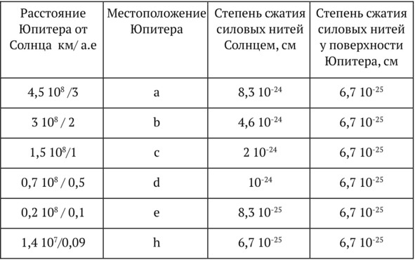 По мере уменьшения расстояния до звезды степень сжатия силовых нитей возрастала. В соответствии с проведенными расчетами, на расстоянии 3 миллиона 500 тысяч километров от звезды степень сжатия силовых нитей окружающего Солнце пространства и степень их сжатия на поверхности Юпитера сравнялись (таблица 1 пункт h) и он перешел на орбиту вокруг звезды (Рис.1).