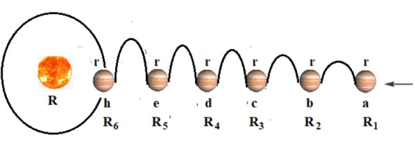Поясним это на примере тандема Солнце – Юпитер. Масса Солнца в 1000 раз больше массы Юпитера. Степень сжатия силовых нитей на поверхности звезды в 100 раз превышает степень их сжатия на поверхности планеты (таблица 1). Силы сжатия силовых нитей Солнцем и Юпитером убывают пропорционально квадрату расстояния. При гравитационном взаимодействии звезды и планеты, силы сжатия, создаваемые Солнцем, будут притягивать Юпитер, а силы сжатия планеты будут этому препятствовать. А так как первые будут значительно превышать вторые, то планета будет, как бы пританцовывая, сначала медленно, а затем по мере сокращения между ними расстояния, все быстрее будет мигрировать в сторону звезды. Процесс этот будет протекать до тех пор, пока степень сжатия силовых нитей, создаваемых Солнцем, не приблизится к степени сжатия их на поверхности Юпитера. В этом случае планета совершит оборот вокруг своей оси в направлении, в котором вращается звезда, получит поперечную скорость и станет вращаться вокруг Солнца. На рисунке 2 представлена схема миграции Юпитера с места образования до места, где он начинает вращаться вокруг звезды. Юпитер предположительно сформировался за линией льда на расстоянии двух астрономических единиц от Солнца. На таком расстоянии от солнечной системы, по расчетам, проведенным на основе базисных принципов смоделированной системы, степень сжатия Солнцем силовых нитей, составляла 8,3 10—24 см (таблица 1 пункт a). А степень сжатия силовых нитей на поверхности Юпитера выше и составляет 6,7 10—25 см. Эта разница ещё не критическая и Юпитер начал движение на встречу Солнца