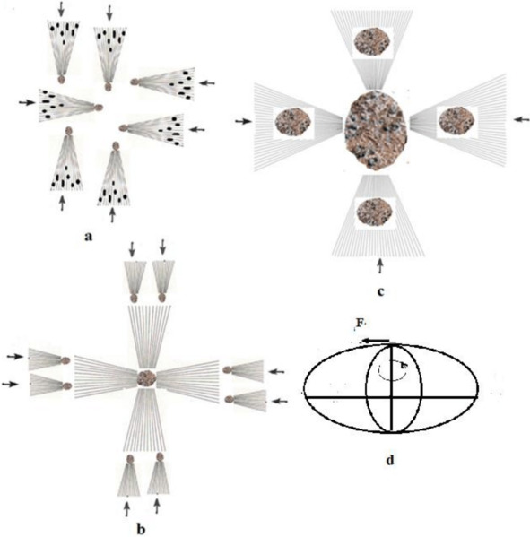 Рис.2. Стадии образования планет и схемы начала их вращения: a – образование местных уплотнений, b – образование планетеземалей, c – образование зародыша, d – начало вращения планеты, F – сила, действующая на ось планеты, определяющая направление её вращения.