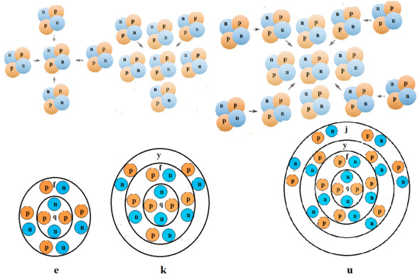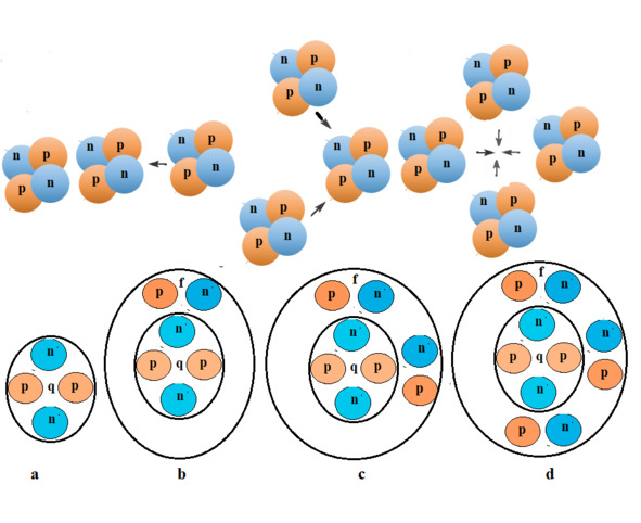 С ростом гравитационного сжатия в недрах звезд увеличивается температура звездного вещества и степень деформации (сжатия) силовых нитей внутри звездного пространства. При повышении в центральной части звезды температуры около 107 K степень сжатия силовых нитей составит 0,33 10—25 м (таблица1). Это несколько превышает степени сжатия их во внутриатомном пространстве атома водорода, в результате электрон преодолевает притяжение ядра и вылетает из атома. Образуется « бульон « из высоко энергичных и высоко скоростных протонов и электронов. Дальнейшее повышение температуры до 107 K и связанного с ней увеличения степеии сжатия силовых нитей до 0,22 10—25 м приводит к следующим процессам. Протоны поглощают электроны и превращаются в нейтроны. Затем протоны объединяются с нейтронами и образуют дейтроны. Как только степень сжатия достигнет величины равной таковой в ядре гелия, два дейтрона сливаются и образуют ядро гелия. Законсервированная в связях протон – нейтрон энергия пространства переходит в энергию материи и выделяется в виде ядерной энергии. Ядро гелия представляет собой первую энергетическую оболочку (q), входящую в состав ядер всех химических элементов (Рис.1a). Каждый нуклон в ядре находится в квантовом состоянии, обладает определённым количеством энергии и моментом вращения. Согласно принципа Паули, в одном состоянии могут находиться не более одного протона и одного нейтрона. Оболочка состоит из двух энергетических уровней: уровень протонов и уровень нейтронов. Она полностью заполнена нуклонами. Изотоп атома гелия с ядром 4He стабилен и имеет повышенную устойчивость. Вокруг ядра обращаются два электрона с антипаралельными спинами. Оба электрона находятся на самой низшей по энергии орбитали 1s2, граничная поверхность которой является симметрично-сферической. Внутри этой поверхности силы сжатия уравновешиваются силами расширения. Здесь электронная плотность достигает своего максимального значения. Степень деформации (сжатие) силовых нитей пространства до граничной поверхности высока и однородна, а за ней, то есть вокруг эффективного радиуса атома) очень незначительна, что делает химическую связь гелия с другими элементами трудно доступной.