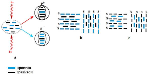 В теории взаимодействия материи и пространства массу элементарные частицы приобретают в процессе движения гравитонов в силовых нитях пространства. Рассмотрим это на примере рождения пары частица – античастица протон – антипротон при столкновении двух фотонов с энергией равной двойной сумме масс протона 1,88 КэВ (Рис.2.а).