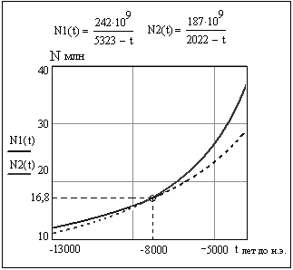 Дело в том, что теоретически имеется две гиперболы, а не одна. Первая, N1(t), служит хорошей аппроксимацией алгоритму роста до неолита. Вторая, N2(t), интерполирует теоретическую гиперболу, которая является «точечной» функцией (т. е. ее областью определения и множеством значений являются 256 фиксированных значений времени и численности). В момент начала неолита, восемь тысяч лет до н. э., и происходит переход с первой гиперболы на вторую.
