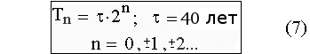 Отрицательные значения параметра n = -1, -2, -4 в формуле (7) задают среднюю длительность экономических циклов Кузнеца, Жугляра и Китчена. Любопытно, что при n = -9, -11, -14 получаем, причем с приличной точностью, для продолжительности коротких инновационных циклов: месяц, неделю и сутки соответственно.