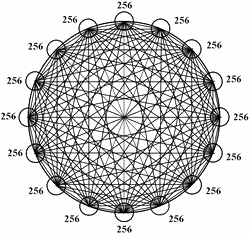 Подведем итоги для сети 256: всего имеется 156 + 15 = 171 цикл (без учета репликации) и восемь гармонических стадий роста с числом клаттеров 2, 4, 8, 16, 32, 64, 128, 256. Последняя гармоническая сеть с числом клаттеров 256 является также совершенной.
