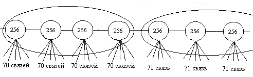 Прирост клаттеров за цикл с этого момента при постоянстве времени цикла идет уже по другой, как мы покажем далее, гораздо более быстрой гиперболе. Т. е. процесс роста сети претерпевает качественный скачок. Допустим, что сеть выросла до размера 71, т. е. содержит 71 клаттер. Для фрагмента сети, изображенного на рисунке, имеем следующее: после копирования четырех клаттеров (Z = 4) получаем (70 + 1)·4 = 284 носителя. Здесь, так же как на первом этапе роста, возможны первые три варианта финализации звена: по минимуму, по максимуму и средний между первым и вторым. Длина звена равна четырем (по первому варианту).