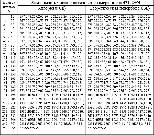 Составим таблицу зависимости числа клаттеров растущей сети от номера цикла для алгоритма и теоретической гиперболы. Зависимости почти не отличаются: максимальное отличие в три клаттера. В таблице выделены гармонические размеры сети.