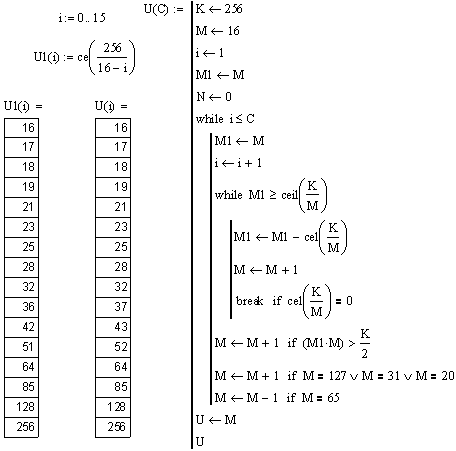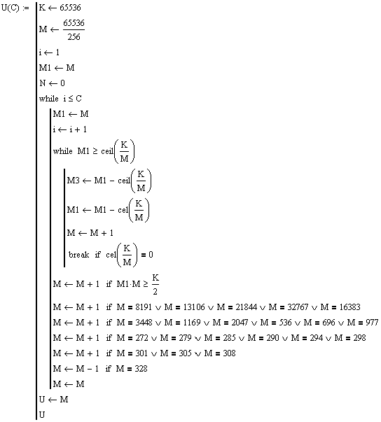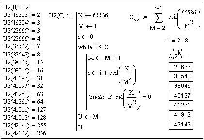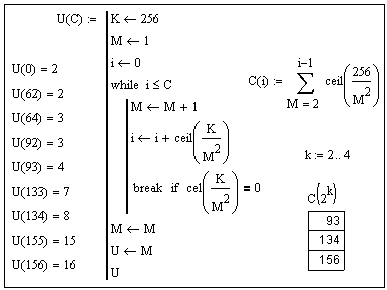 Рассмотрим рост сети 256 на первом этапе от 2-х клаттеров до 16-ти. Приведем пример программы подсчета числа клаттеров за цикл в зависимости от номера цикла, реализованной в системе MathCAD:
