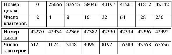 Всего сеть проходит 42142 цикла. Из них пустых 42142 – 254 = 41888. В 254 циклах собиралось по одному клаттеру. На второй виток, в соответствии с алгоритмом, заходить не приходилось.