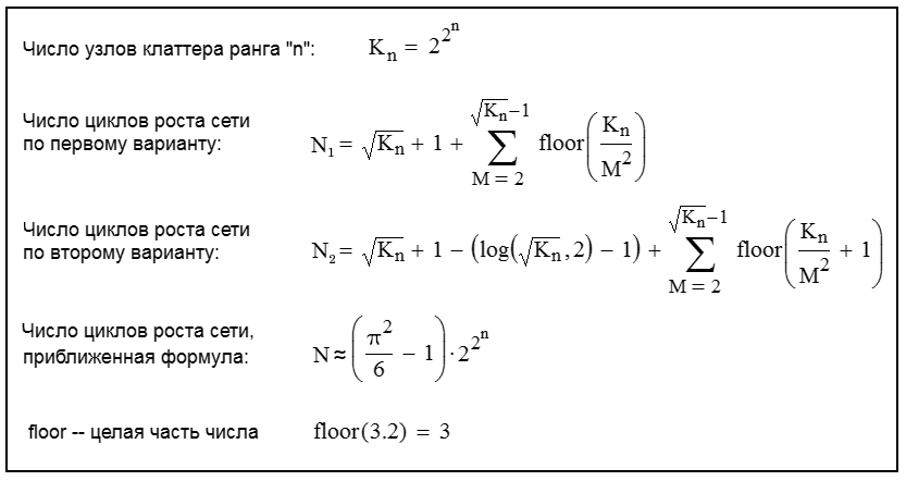 Для того, чтобы найти полное количество циклов, которое проходит сеть любого ранга в процессе своей эволюции, нужно сложить число этих циклов на трех этапах ее роста (считаем, что сеть любого ранга, став совершенной, создает единственную свою копию, на что уходит ровно два цикла[8] и рост сети следующего ранга всегда начинается с двух клаттеров.)