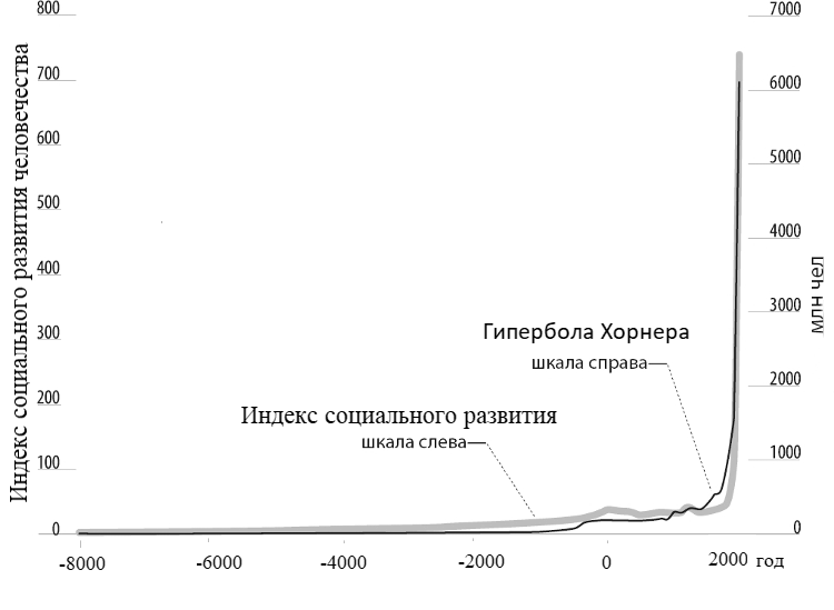 Рис. 2. Гиперболический рост индекса социального развития человечества и численности населения Земли от неолита до 2000 года. [46, 47]