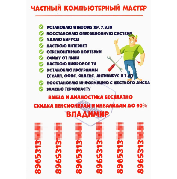 Никодим: Во-первых, в мастерской принято оговаривать максимальную сумму ремонта. А если человек звонит нам и говорит: «У меня компьютер сломался, сколько будет стоить его починка?», мы скажем: «От 400 рублей». И не обманем, потому что это никак не ограничивает нас в конечной сумме. А скажем, что вызов и приезд мастера у нас бесплатный, так клиент совсем расслабится. Во-вторых, у нас привыкли, что официальная мастерская – это дорого и долго. В-третьих, в мастерскую нужно отвозить самому. Если у человека настольный компьютер, никуда он его не потащит, вызовет кого-нибудь домой.