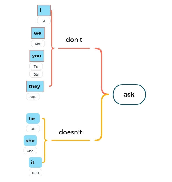 Схема отрицательного английского предложения для простого настоящего времени с глаголом to ask (спрашивать).