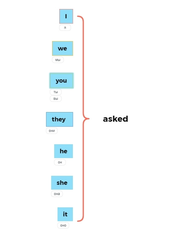 Схема утвердительного английского предложения для простого прошедшего времени с правильным глаголом to ask (спрашивать).