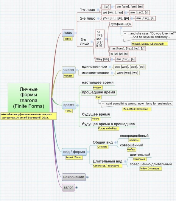 С остальными глаголами будет проще: у них всего несколько возможных форм. При этом так же, как и русские глаголы, английские имеют такие глагольные категории, как лицо, число, время, залог, наклонение (см. далее интеллект-карту «Личные формы глагола» из другой книги автора «Английская морфология в интеллект-картах. Часть 5: причастие»).