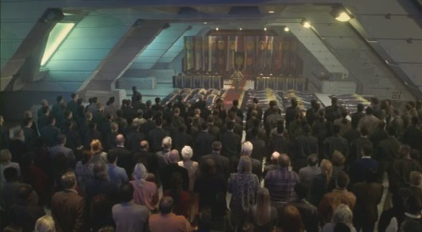 Командир звездолёта выступает перед уцелевшими после нападения людьми.