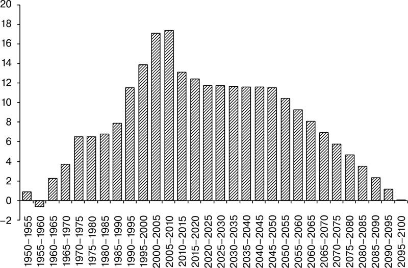 Этот этап, конечно, не может быть простым. Известно, какой огромный отпечаток наложило на состав населения Европы и на всю ее историю Великое переселение народов в I тыс. н. э. Сегодня кажется, что тогда происходили огромные миграции. Они и были большими по тем временам, когда все население мира составляло порядка 200 млн человек. Но в начале XXI в. стремительно растущее число международных мигрантов уже превысило 200 млн [UN 2013-1: Tab. 1], и скорее всего это только начало. По оценкам ООН, между 1975–1980 и 2005–2010 гг. чистая миграция из развивающихся в развитые страны за пятилетие выросла с 6,5 до 17,4 млн человек [UN 2013-2: fileMIGR/2]. Как события будут развиваться дальше? Прогнозы ООН, предсказывающие сокращение перетока населения из развивающихся в развитые страны – вплоть до его полного прекращения к концу века (рис. 1), представляются утопическими, пока ничто не предвещает такого сокращения. В этих прогнозах гораздо больше от нынешних настроений общественного мнения развитых стран, чем от реальной оценки будущего.