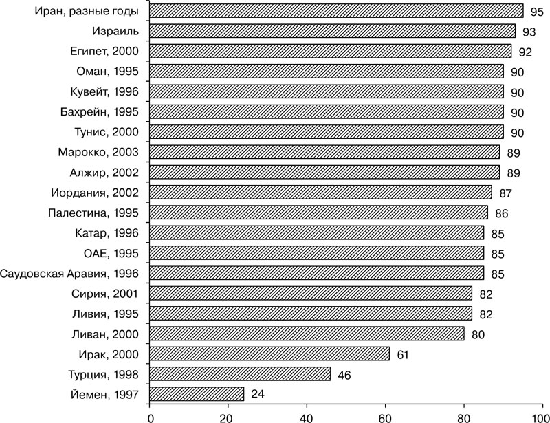 Рис. 1. Доля детей, прошедших вакцинацию в арабских странах и странах Ближнего Востока (дети, получившие все прививки – против BCG, DTCoq, полиомиелита и кори)